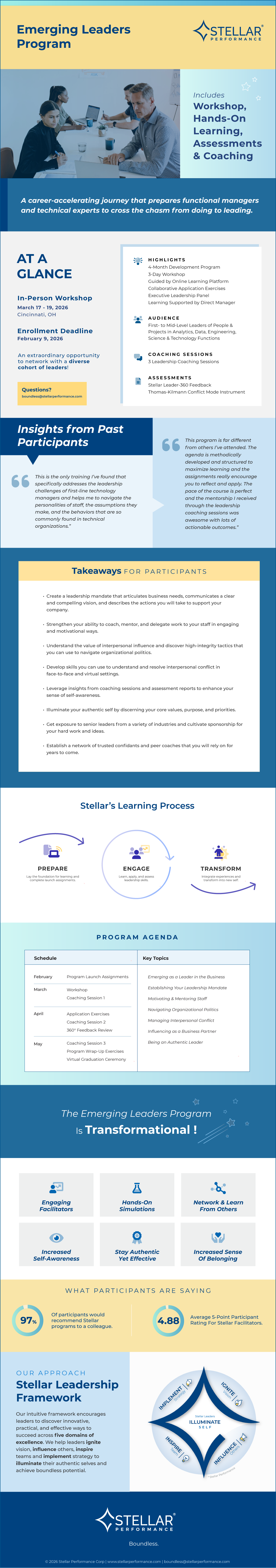 Take leadership to the next level with the Stellar Emerging Leaders Program. This career-accelerating journey is designed to help functional managers and technical experts cross the chasm from doing to leading. The Emerging Leaders Program includes an in-person workshop, 360° feedback, 1:1 coaching sessions, and opportunities to network and learn from senior leaders.